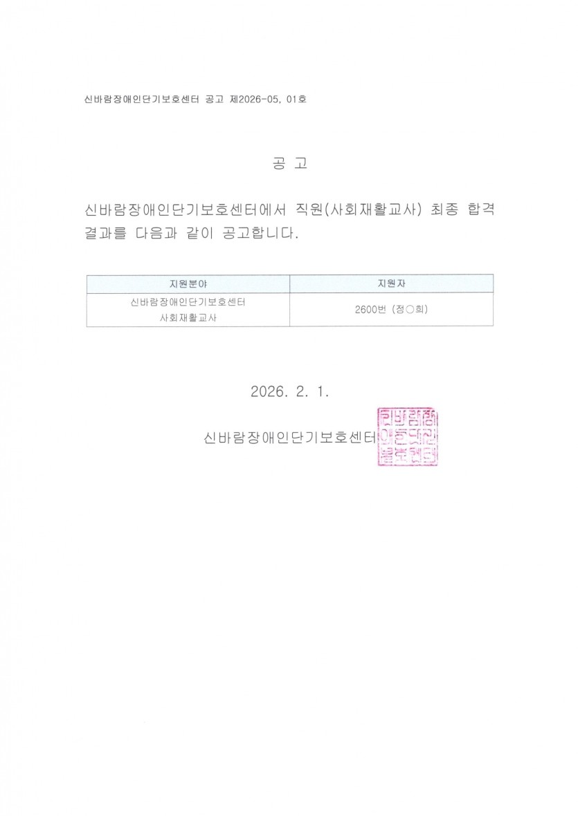 2026년 신바람장애인단기보호센터 직원 채용 결과 공고 페이지 정보 작성자 유명호 작성일26-01-31 17:02 조회10회 댓글0건 관련링크 다음글 목록 답변 본문 채용결과 다음글 목록 답변